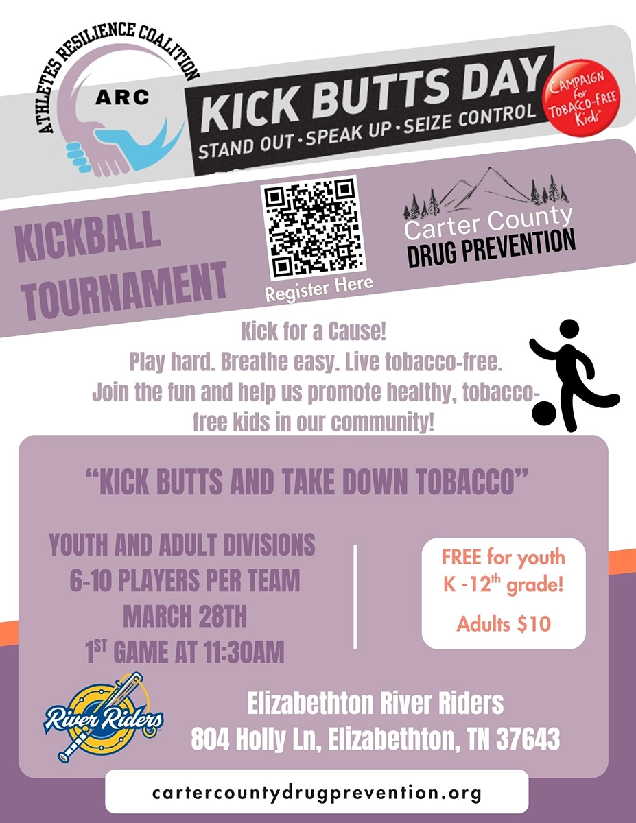 Kick Butts Day Kickball Tournament 2026 Kick for a cause! Play hard. Breathe easy. Live tobacco-free. Join the fun and help us promote healthy, tobacco-free kids in our community! Youth and Adult Divisions6-10 Players Per TeamMarch 28th1st Game at 11:30AM K - 12th Grade: FREEAdults: $10 Please register using the appropriate form below.